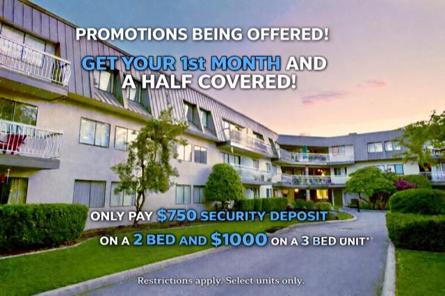 Reduced Security Deposit, First Month & A Half Free Rent on selected suites. Prices and promotions subject to change.
